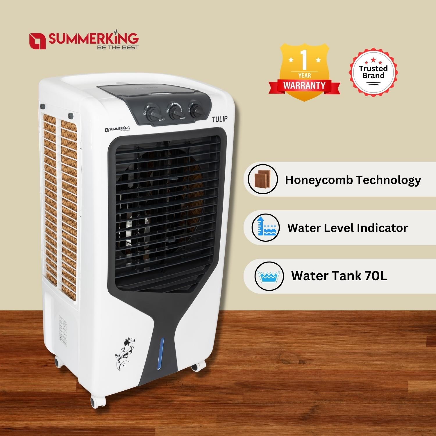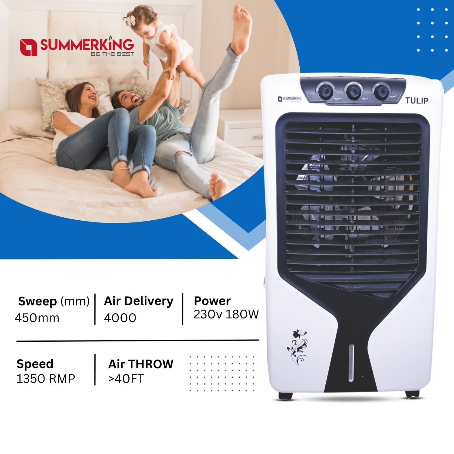 Model Name: Tulip Fan Sweep: 450 mm Capacity: 70 L Power: 230 V, 180 W Speed: 1350 RPM Air Flow: >40 FT. Inverter Compatible: Relatively lower power requirement; Can run on inverter power. Adjustable Air...